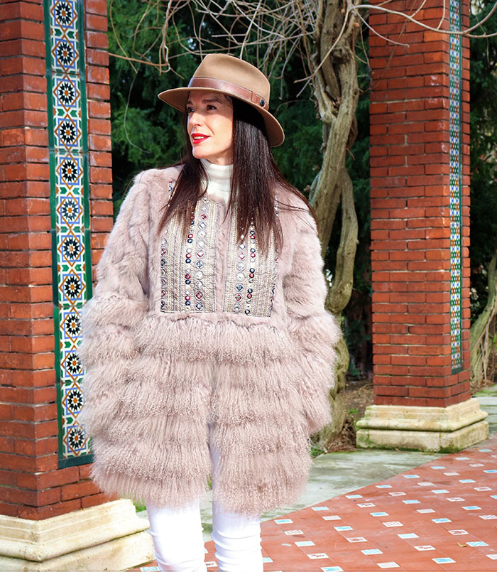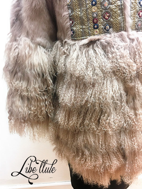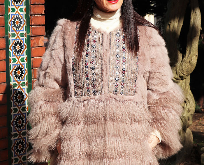 Abrigo de Piel en tono topo con decoración en el aparte delantera.