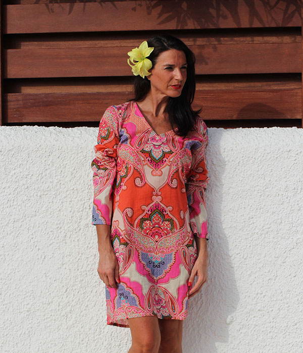 Kaftan con precioso tejido de algodón con motivos de mandalas en alegre colorido.
