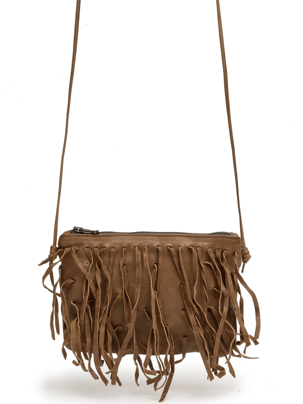 Bolso bandolera pequeño realizado en piel color negro, teñido con tintes vegetales y terminado con un tratamiento de encerado, que le da ese color tan especial. En el frontal lleva flecos, cierre de cremallera. Interior forrado en luneta, lleva un compartimento de cremallera. El asa es regulable para distintas medidas.