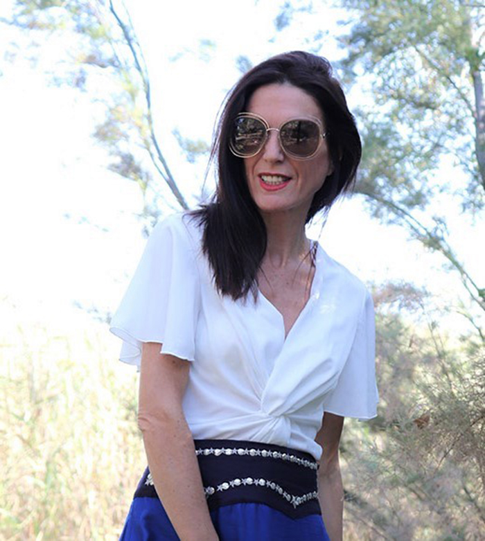 Blusa blanca con nudo en la parte central, escote en pico y manga con volante.