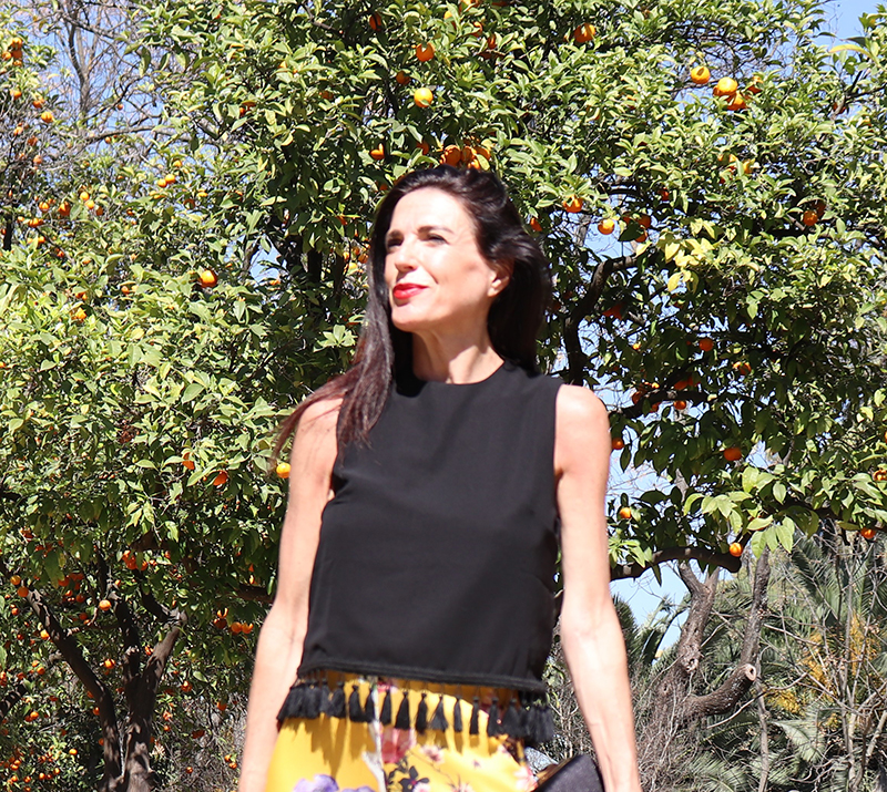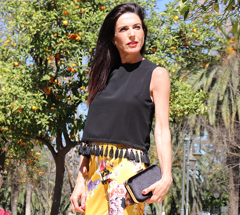 Camisa negra sin mangas con detalle de borlas en la parte baja.