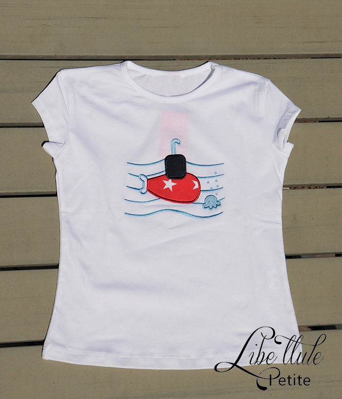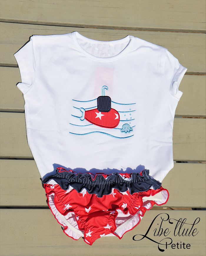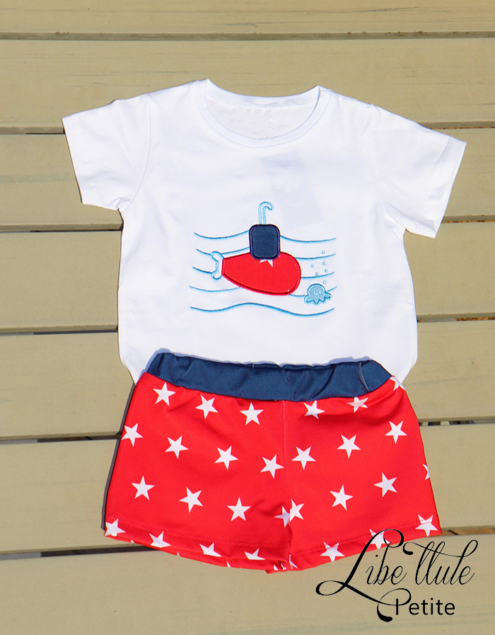 Camiseta con un submarino con de estrellas a conjunto con bañador a conjunto.