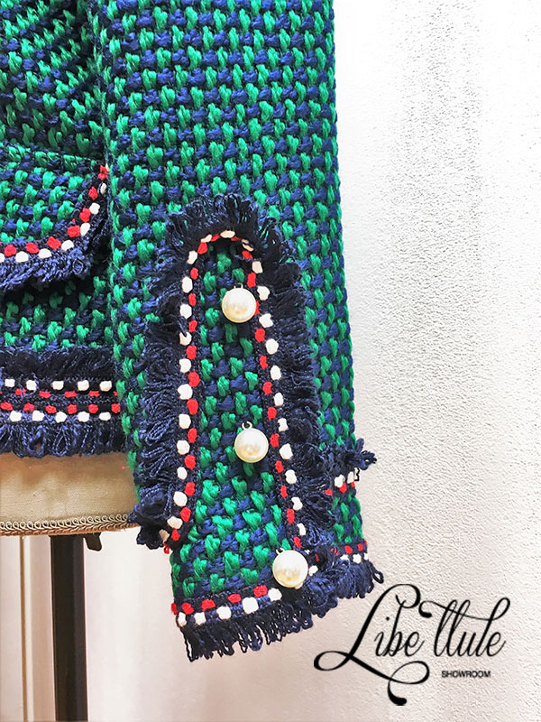 Chaqueta Chanel en color verde y azul marino con cenefa con detalles rojos y blancos y decoración con perlas.