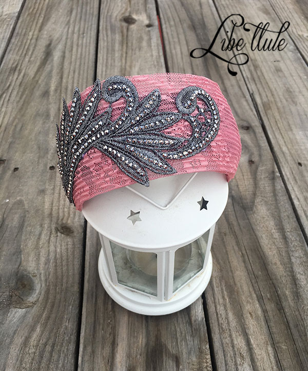 Diadema Audrey rosa de fantasía para un look especial. Base con tejido texturizado de rayas y encaje con aplique de encaje y pedrería.