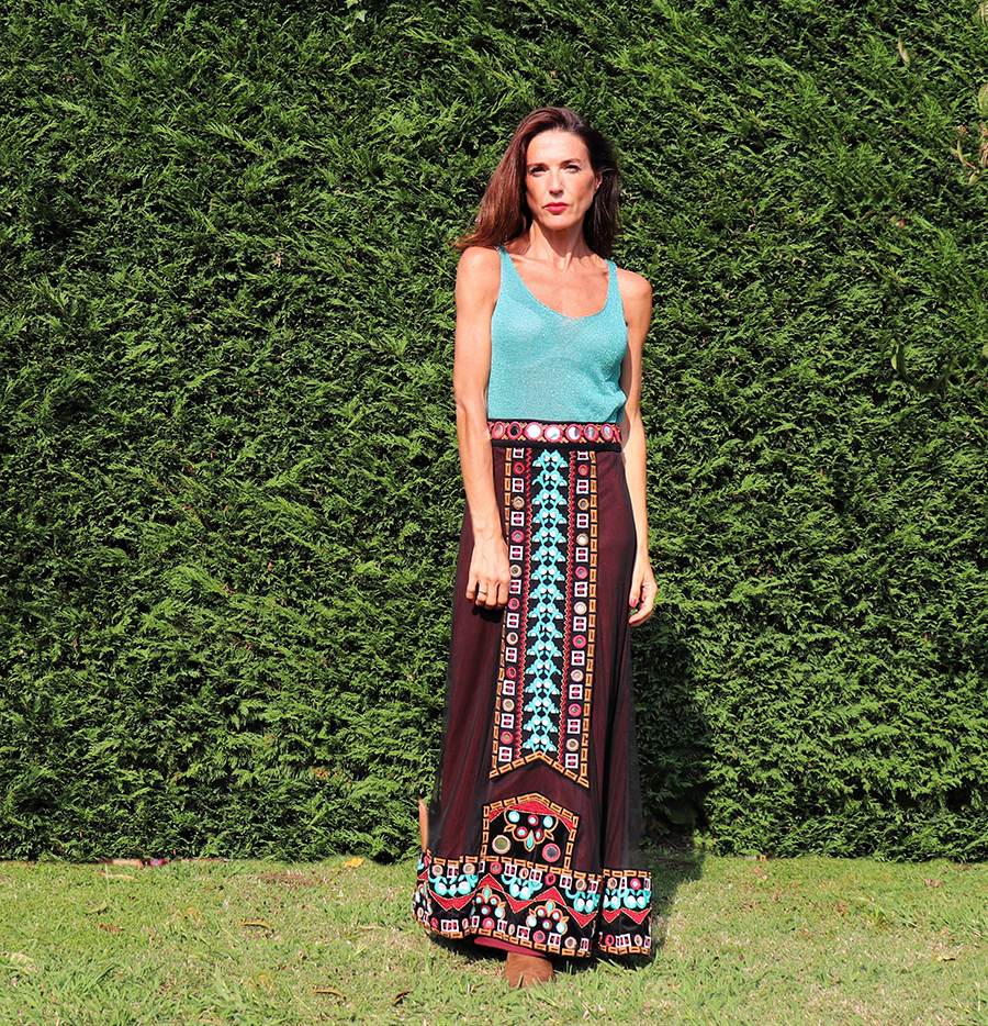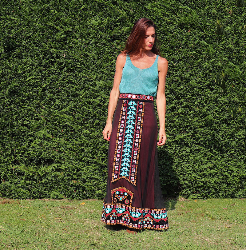 Exquisita falda boho chic con forro interior y decoración con bordados y espejos.