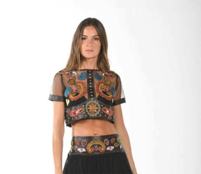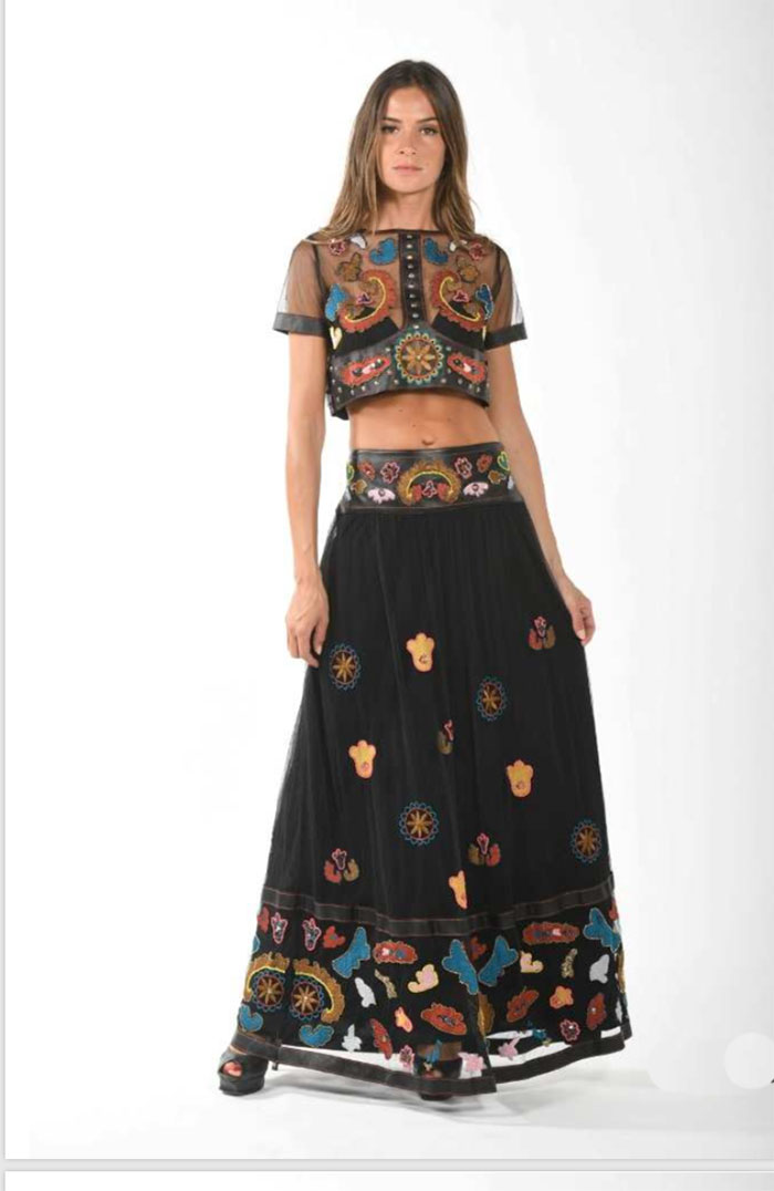 Exquisita falda larga estilo boho chic con preciosos bordados y decorados de abalorios.