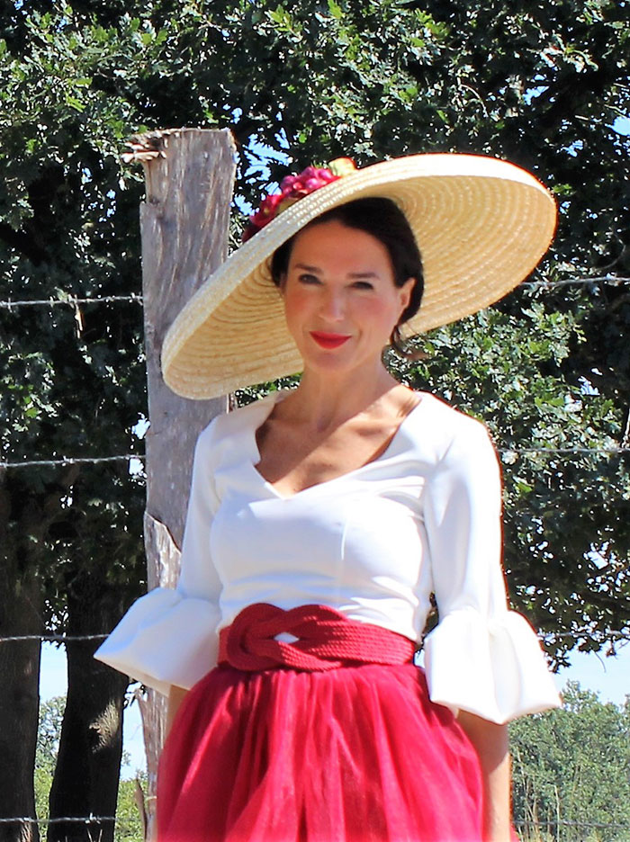 Pamela de ala ancha con flores en rojos rojos y granates.