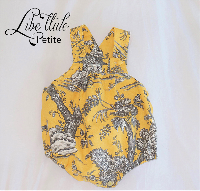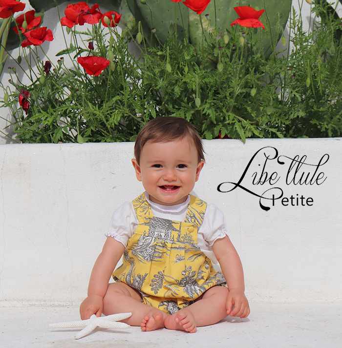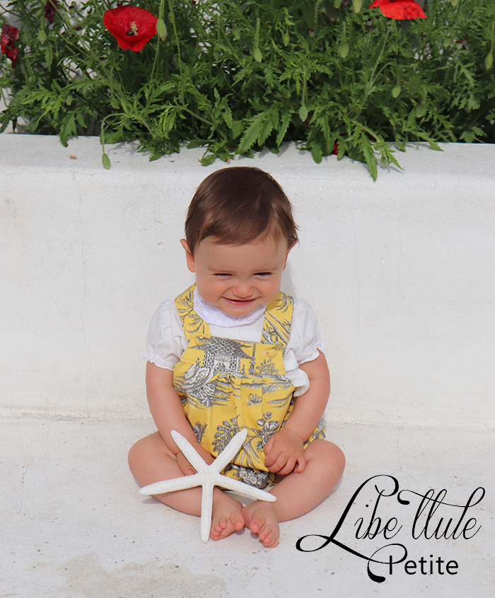 Peto de Petite Libe llule de Toile de Jouy en color amarillo y gris ideal para los más pequeños. Confeccionado con mimo de manera artesanal y cuidando cada detalle desde la talla 3 meses y hasta 18 meses.