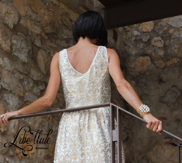 Vestido exclusivo que solo encontraras en libe llule, un vestido con escote en barco en la parte delantera y con escote en pico a la espalda, con una tela de gran calidad aterciopelada,con mucho cuerpo y con motivos adamascado en dorado.