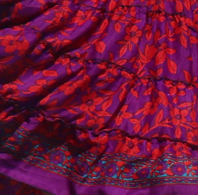 Vestido asimétrico de seda con un bonito estampado en tonos rojos y morados.