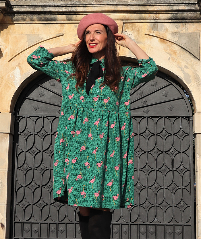 Vestido camisero con lazada al cuello si se desea, con estanpado de tops negros y flamencos rosas sobre fondo verde.