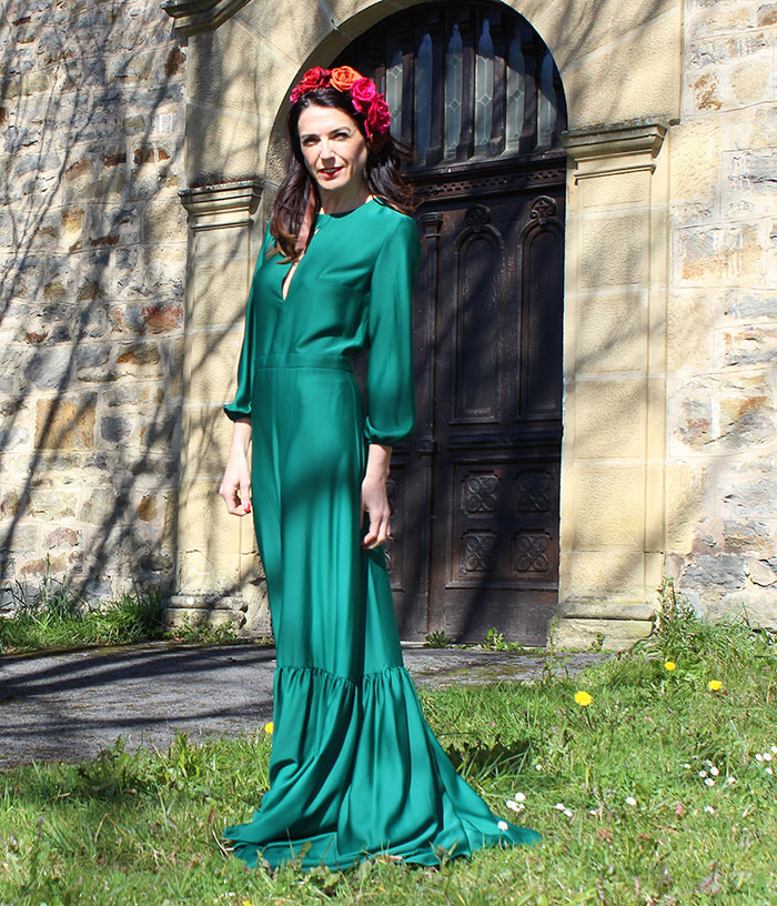 Vestido largo con mangas y volante bajo con abertura en la parte delantera y en espalda. Cuello a la caja.